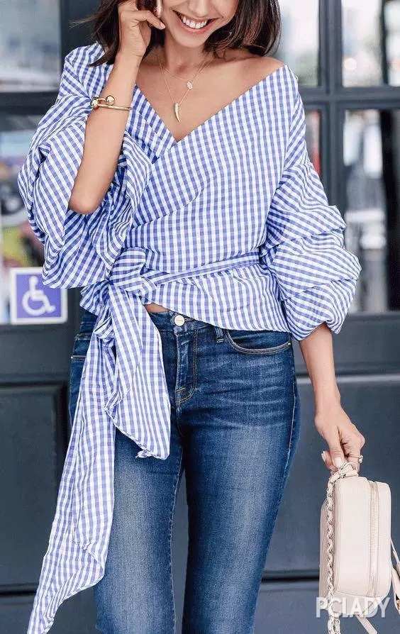 这种露胃装的将整件上衣直接变成一个大蝴蝶结,深V的领口和露腰设计虽然看似简单但却有趣,又能把性感的曲线展露无疑,直接搭配牛仔裤或者简单的铅笔裙就打造Chic感。