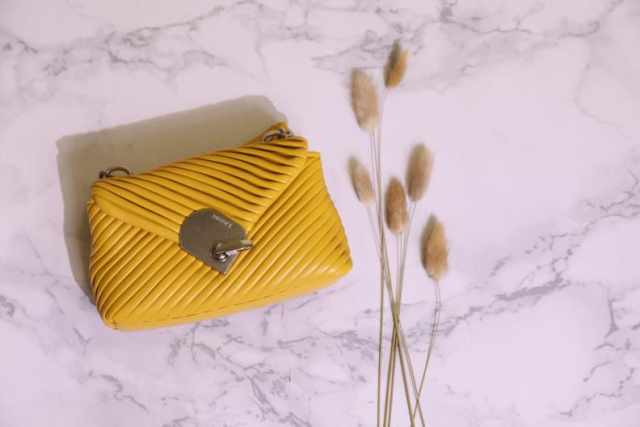 柠檬黄的颜色既充满活力,倒也给人一丝清凉感。皮革材质做成褶皱的编织效果,让它显得更加特别。