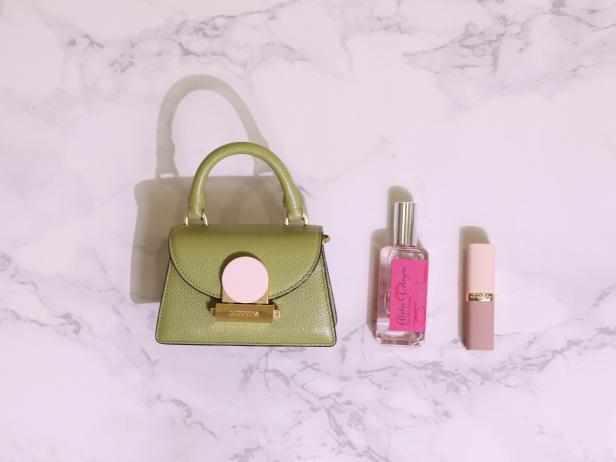DISSONA的另一只包袋是一只抹茶绿的mini小包,锁扣处有一个粉嫩的圆形装饰。既有撞色的意味,还增添了春夏的清新感。
