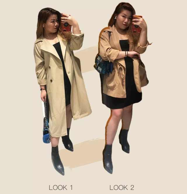 风衣的长度亦是如此,为了特别显示不同长度的风衣对身高的影响,我特意用这条黑色的蹦迪裙来搭配两款长度截然不同的风衣: