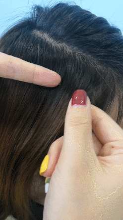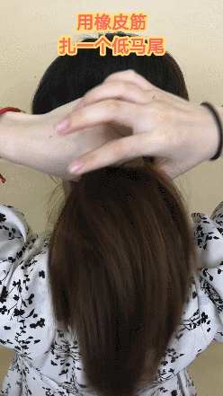 ③用橡皮筋把所有头发扎成一个低马尾之后,拉松头顶的头发,会让头型更好看,最后拿走两边的发卡就行啦!