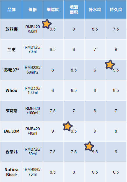 喷洒面积最大:EVE LOM最补水:香奈儿