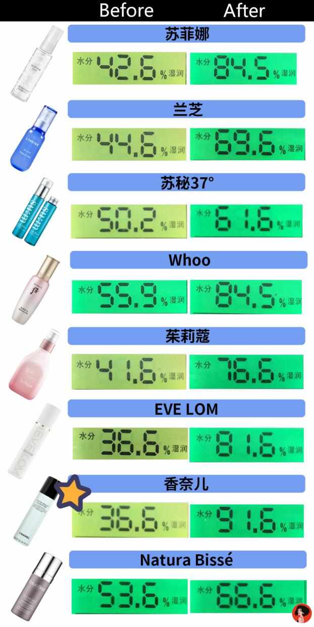 香奈儿以增加了55%的水分获得第一名!增加了45%水分的EVE LOM位居第二