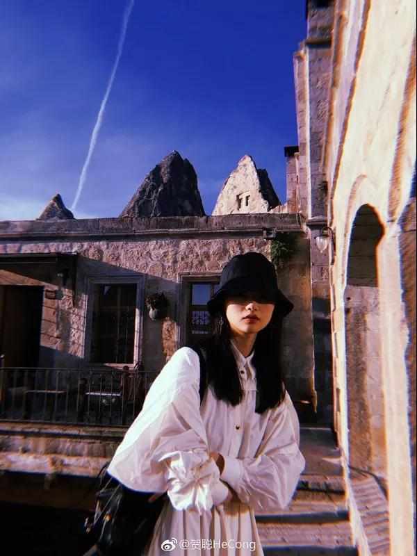贺聪这个夸张的羊蹄袖衬衫裙自带了满满的复古味道,再配上精致耳环与渔夫帽文艺又时髦。