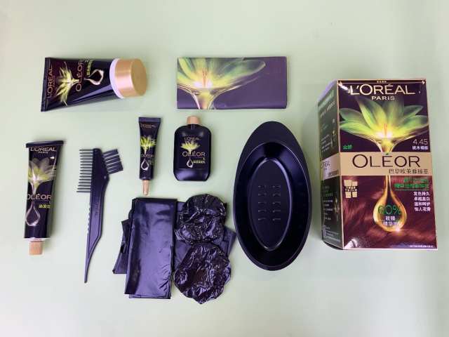 欧莱雅染发霜配置就很豪华了,除了染发霜、显色敷用乳外,还带有染后润发乳和染后护理精华油,自带小碗梳子还有围兜手套耳罩的设计也非常贴心,绝对要打100分。