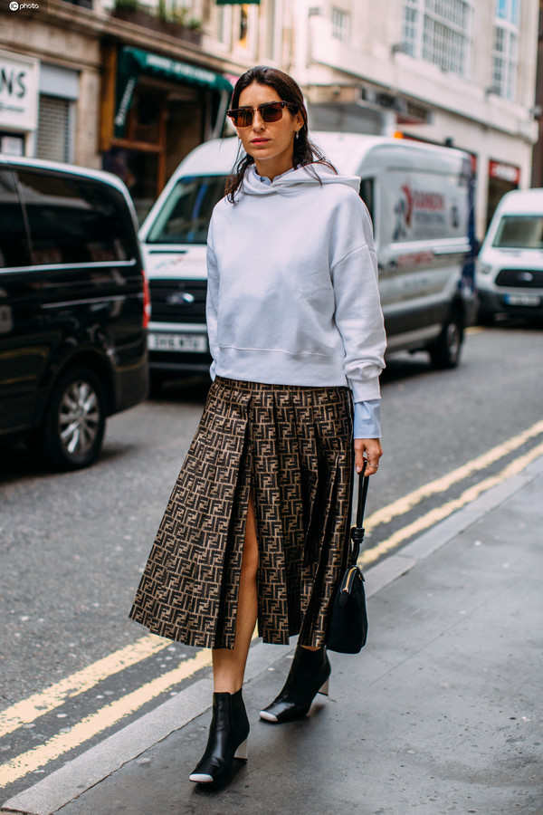 当然,彩色卫衣除了搭配裤装以外也能搭配半裙来穿,而且会比裤装更有女人味一些,大家可以根据自身条件酌情选择裙子长度,大腿粗选择及膝裙,小腿粗选择短裙,都粗的话只能选择拖地长裙了!