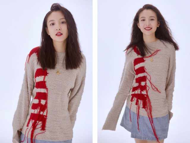 除了彩色卫衣,倩倩之前穿过的流苏拼色毛衣其实也是能很好地展现少女元气的单品,这一类在设计上很能抓人眼球的款式我们暂且把它称之为趣味毛衣。