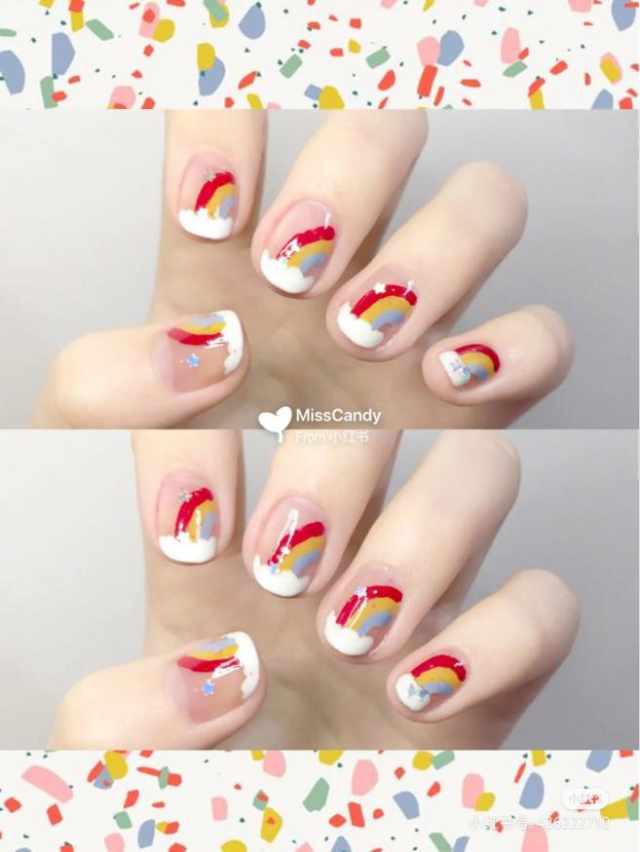 彩虹与白云可是绝配!如果五个手指都做这么花的彩虹,底色就选择透明的就好啦!