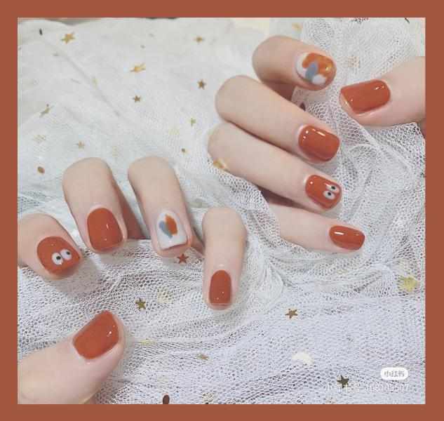 如果喜欢简单一点的,就以纯色为主,在无名指上画两个小眼睛,是不是也很生动形象呢~