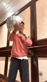 左手拿着台灯,右手放在左肩,然后手臂摆动台灯。