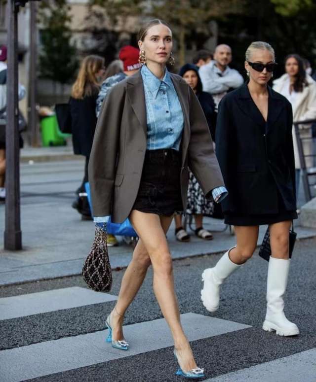 深蓝色和熟褐色为主色,本质上这两种颜色是属于对比色,但是碰撞在一起时强烈却又相互补充,穿上身时也是轻松又高级的着装。在棕色的外套里加一件蓝色衬衫,领口的蓝色既不会破坏整套着装的大女人气场,还会增添一抹潇洒风度。