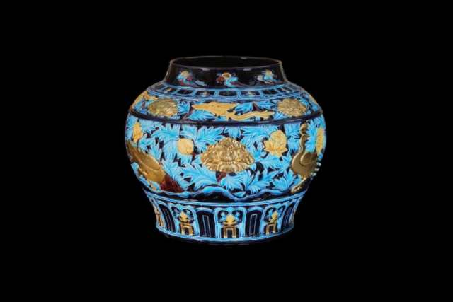 珐华凤鸟牡丹纹剔刻贴金大罐