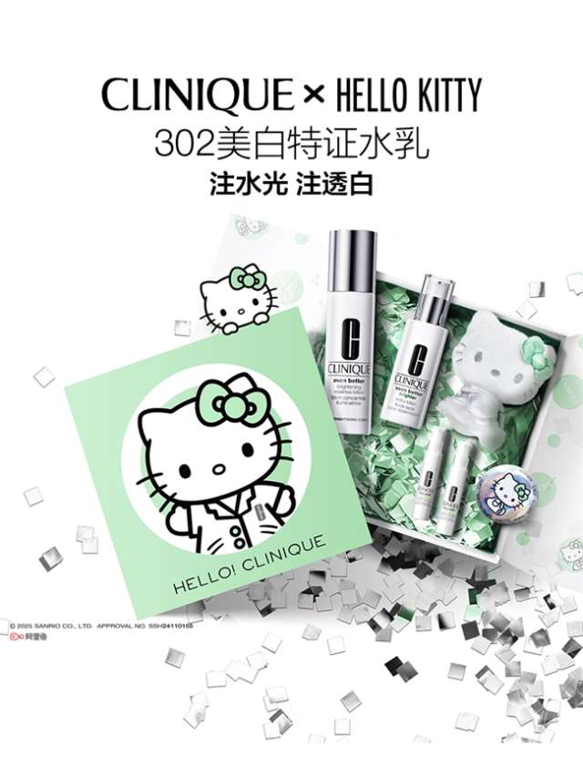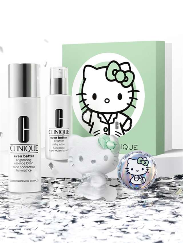 持证美白,水光透亮。“护肤科学家”Hello Kitty现身Clinique倩碧“绿色实验室”,为你推荐【敏肌稳白CP礼盒】: