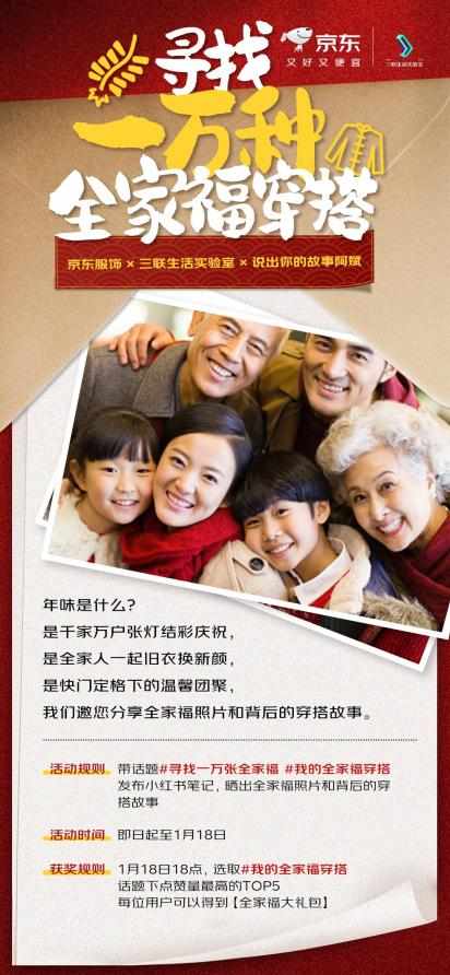 根据活动规则,即日起至1月18日,带话题#寻找一万张全家福、#我的全家福穿搭 发布小红书笔记,晒出全家福照片和背后的穿搭故事,话题下点赞量最高的TOP5的用户,可以得到由京东服饰提供的价值超500元的全家福大礼包。