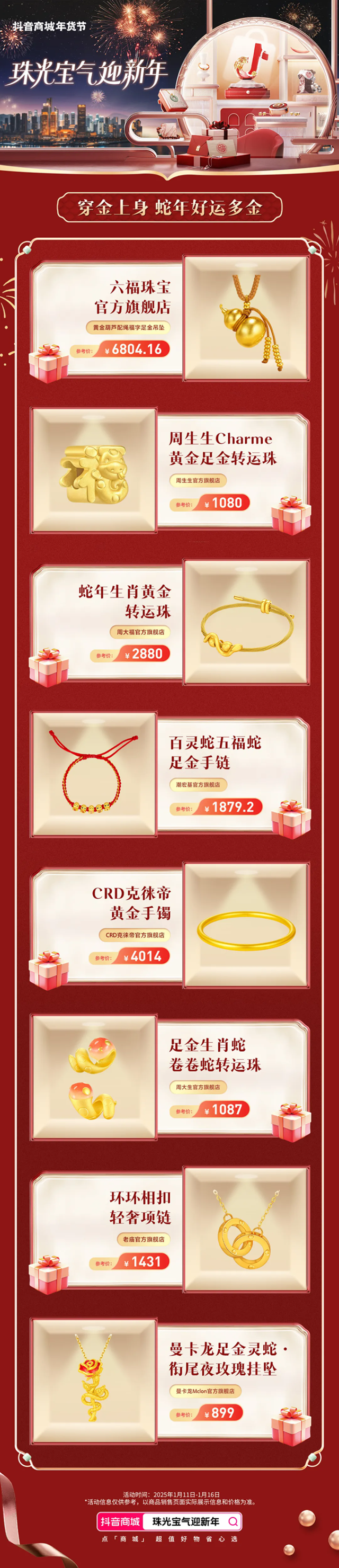 过年少不了走亲访友,珠光宝气的首饰配件、潮奢文玩为你撑足场面。品类日期间,蛇年限定黄金彩宝及转运好物,带来蛇年好运多金的美好寓意;大牌手链、箱包等潮奢贵气好物,让新年穿搭眼前一亮、穿出好运。海量尖货,都将集中上新。