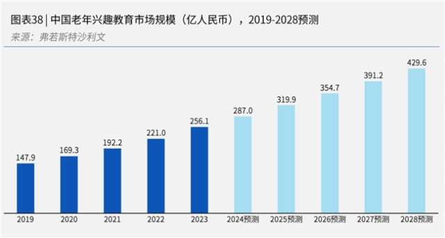 根据沙利文《2024年中国银发经济发展报告》显示,2019年到2023年,中国老年兴趣教育市场规模实现年复合增长率14.7%的快速增长,从147.9亿人民币增长至256.1亿人民币,增幅高达73.1%。未来报课需求在持续增长,预计从2023年开始,中国老年兴趣教育市场规模将以10.9%的年复合增长保持规模化扩张,并在2028年市场规模突破400亿元人民币。
