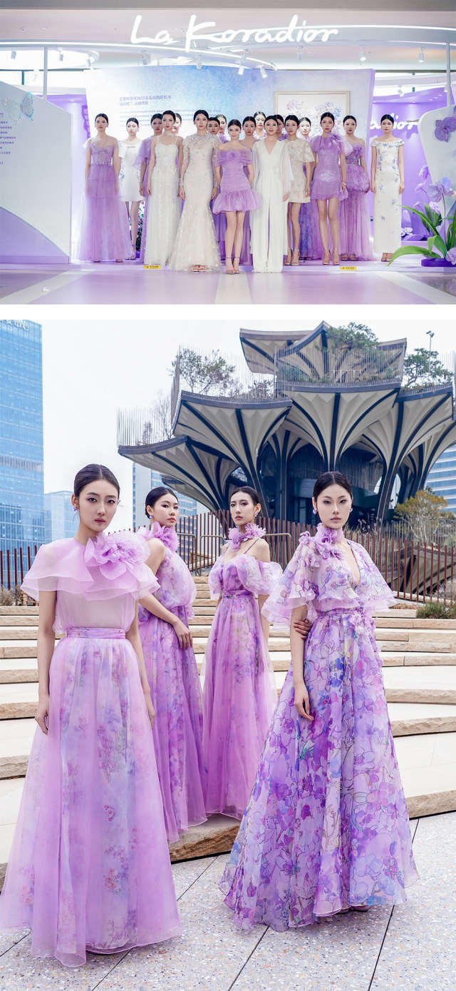 高级时装所运用的绮丽色调从品牌色La-purple中提取晕染,通过轻盈材质呈现于服饰上,品牌花蝴蝶兰在匠心巧妙与非凡设计下,以立体、刺绣、镂空的形式脱颖而出,整体设计精湛运用La Koradior拉珂蒂经典斗篷廓形,再绎经典。