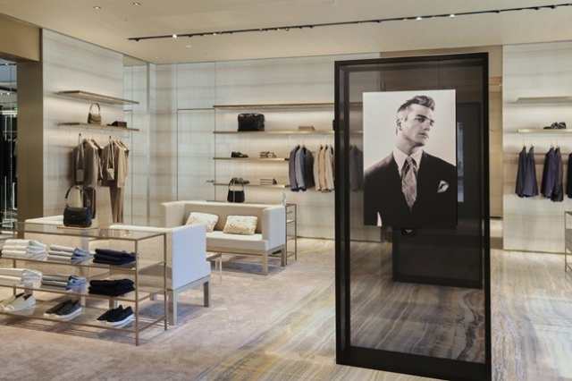 一层空间陈列女装成衣与美妆系列,Armani/Casa棕榈叶地毯为现代设计注入自然韵律;二层男士专区通过丝绸壁纸与定制西装工坊,构建私密尊享空间。店内涵盖成衣、配饰、高级珠宝、Armani/Privé香水及奢华腕表等全品类商品。