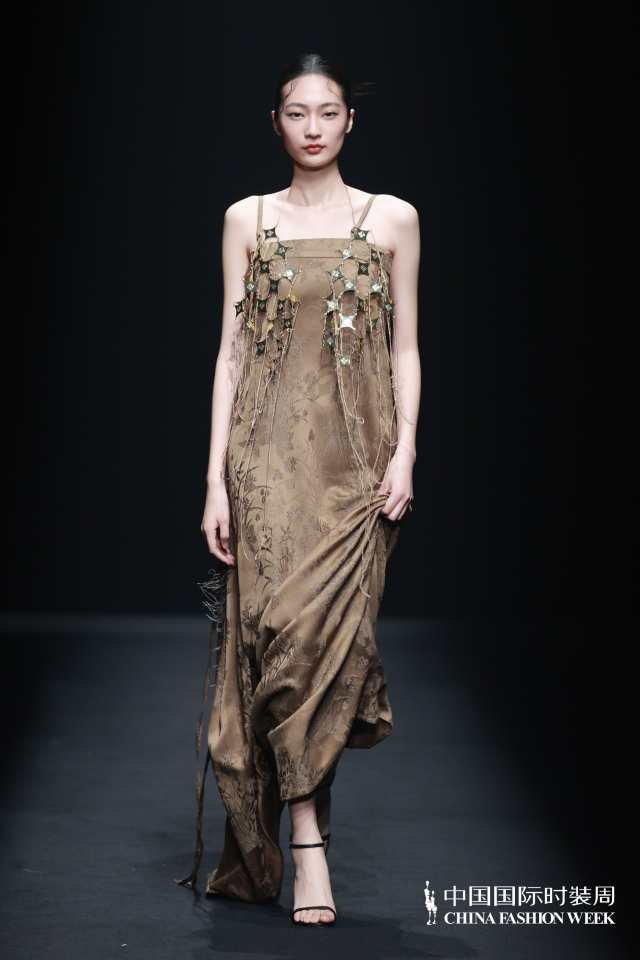 本季在工艺上巧思妙想,在延续上一季的流苏元素基础和风格延续下,将金属链条与本系列服装结合,重新构造,对金属链条进行编结、垂荡,来模拟随动的流水景色。并结合中国文化中铜钱的铸造工艺,打造出水波荡漾的效果,古法今用与金属链条相结合,和随形而动的服装造型,一起营造出高山流水的随性洒脱。