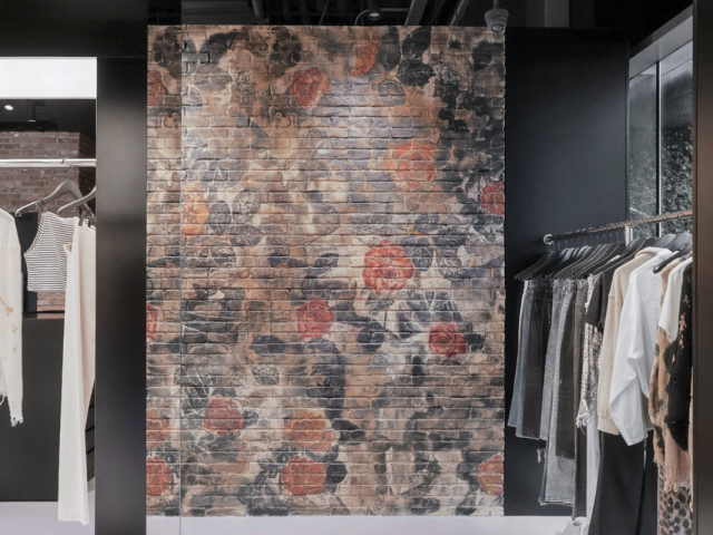 成都太古里精品店空间将纽约地下文化的反叛基因注入设计语言:工业风格的砖墙与解构主义涂鸦形成视觉张力,数字LED屏幕与做旧皮革家具重构时空维度,开放式动线设计巧妙平衡街头粗粝感与高定奢华性。空间以花卉迷彩为基底、缀以盛放玫瑰的涂鸦墙为核心——冷峻丛林绿与炽烈花卉的冲突共生,创新诠释R13标志性的“破坏性优雅”哲学。