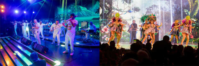 蒙特卡洛星际大厅(Salle des Etoiles)的入口被设计师打造成一片风格鲜明的热带日落森林,并借由一条小径唤起宾客对加勒比日落时分温暖夜晚的回忆。舞台上的装饰更是令人惊艳,一座由经过海水和阳光风化的木板制成的标志性吧台矗立于此,向宾客发出派对和狂欢的邀请。吧台的装饰就像一个剪贴画:棕榈树、郁郁葱葱的热带森林、标牌、果汁车和象征加勒比海的遮阳伞混合在一起,背景板上装有视频映射,让海滩装饰栩栩如生,并随着夕阳西下而熠熠生辉。