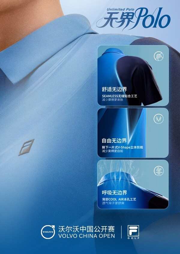 本届赛事中,FILA GOLF将继续为赛事提供专业科技装备,为所有官员、裁判、志愿者提供专属定制赛事战袍,用高性能服装为赛事人员带来优质穿着体验。核心赛事赞助服装无界POLO以"无界科技"自成焦点,FILA GOLF品牌形象代言人许龙一与新星菁英团球员陈子豪将身穿定制无界POLO闪耀沃尔沃中国公开赛赛场,展现专业竞技表现。该系列采用先进的SEAMLESS无缝贴合工艺,有效减少摩擦,带来更亲肤的舒适体验;腋下一片式V-Shape立体剪裁设计,让每一次挥杆都更加自如流畅;背部的COOL AIR冰孔工艺实现全天候透气控温,显著增强透气导汗性能,助力运动员在赛场上发挥出绝佳竞技水平。无界POLO深化了"舒适无边界"、"自由无边界"、"呼吸无边界"的三重无界版型科技,一件POLO掌控多元主场,传递赛事"无界破局,高手上场"主张,以专业科技重构运动叙事,护航球员赛场竞技,助力赛事全面升级。