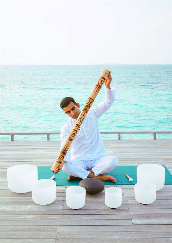 团体疗愈课程包含海上日出/日落瑜伽、双人/家庭瑜伽、泳池健身、漂浮音疗冥想、夜光空中瑜伽与烛光冥想。