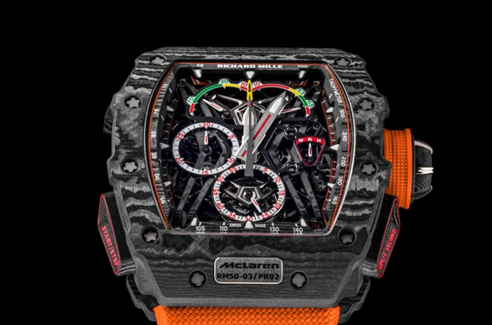 RM 001正如迈凯伦传奇车手埃尔顿·塞纳所说:“若不再为那道存在的差距奋力一搏,你便不再是赛车手了。(If you no longer go for a gap that exists, you’re no longer a racing driver.)”这句话放在RICHARD MILLE的工坊里,同样成立——在他们的字典中,“极限”永远不是句点,而是创作的前提。RICHARD MILLE从来不是为了取悦过往或荣耀,而是将自身腕表的制作标准,锚定于一级方程式赛车的赛事逻辑之中,永远挑战,绝不妥协。RICHARD MILLE在“千钧一发”之中找到了制表的终极表达,若说传统钟表是时间的古典语法,那么RICHARD MILLE便是时间的未来派诗篇。与F1深度绑定,并非只是为了借势或冠名,而是RICHARD MILLE出于对“技术进化哲学”的深度认同。在这个全球对抗空气阻力、材料极限与人类反应速度的终极竞技场,诞生的科技、设计语言与材料应用,最终被转译进RICHARD MILLE腕表的机芯系统与表壳结构中,形成一条从赛车场延伸到手腕的技术链路。从与巴西车手菲利普·马萨(Felipe Massa)的早期合作开始,RICHARD MILLE便把这种属于未来的思维方式搬进了实验室。通过车手实地佩戴、极限测试、运动反馈,RM系列不断迭代,在重量、抗震、结构、气动性等多个维度上打破传统制表的边界。迈凯伦车队正是这条链路中最具代表性的节点之一。早在1981年,迈凯伦就首创了用碳纤维单体底盘打造赛车的革命性技术,将赛车的强度提升至新高峰。这一工艺之后影响了整个汽车工业。自2016年2月与迈凯伦建立起长久的合作伙伴关系以来,RICHARD MILLE成为将这一技术成功引入制表领域的先锋——他们使用的Carbon TPT®碳纤维,不仅拥有赛车级的抗拉强度,还通过上千层交错排列,在视觉上呈现出仿若碳浪般的纹理图案,使每一枚腕表都如同一台独一无二的赛车。与迈凯伦的合作,是RICHARD MILLE与车队之间“理念与工程”的真正共鸣,不只是象征性地“致敬赛车”,而是实质性地复刻赛车的结构哲学。RM 50-03 McLaren F1是这段关系的结晶——它将机械表的重量压缩至仅有38克,包含表带,这是有史以来最轻的机械计时码表。这一成就的背后,是RICHARD MILLE联合曼彻斯特大学材料实验室所研发的新材料Graph TPT®:这是一种掺入石墨烯的碳纤维材料,强度是钢的200倍,但重量仅为其六分之一。整块腕表不是简单套用材料,而是在F1对结构效率的理解中,将表壳、夹板、桥板等结构一一重塑,优化路径、减少冗余,最终让“时间在腕间飞驰”。