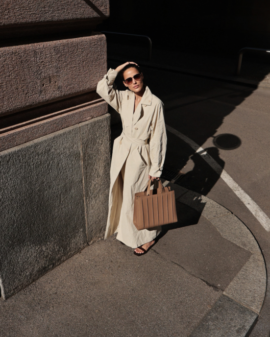 时尚博主Alex Riviere以米色极简风衣搭配驼色系十周年纪念款Whitney手袋于街头漫步,沉稳配色与挺括廓形交织出平衡之美,诠释出都市女性对理性美学的精准拿捏。