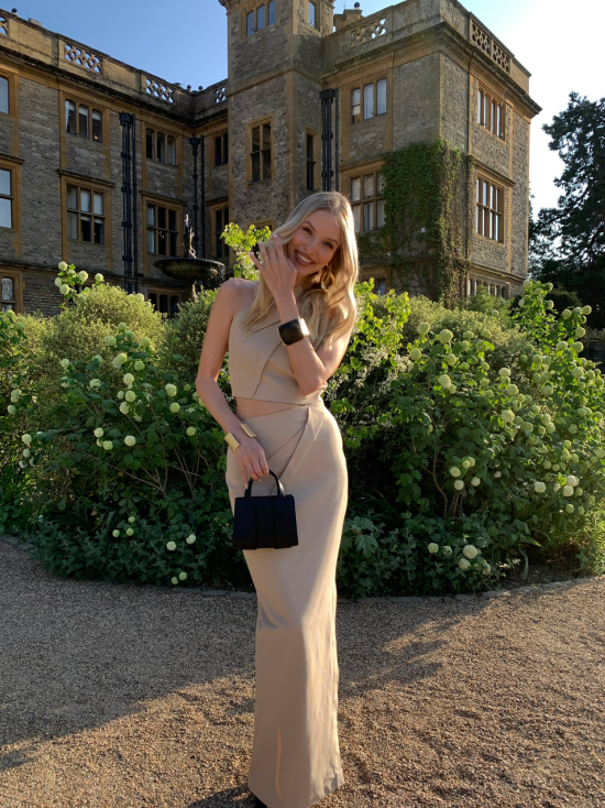 德国时尚博主 Leoni Hanne 身着裸色系礼服现身英式古堡庭院,手拎黑色小号十周年纪念款Whitney手袋,尽显高贵柔美气质。阳光洒落在利落剪裁与经典包型之上,映衬她一贯的精致造型风格。