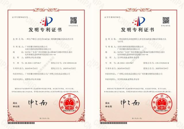 值得一提的是,谷雨近期在稀有人参皂苷CK这一成分制备环节中的两大核心自研技术《一种生产稀有人参皂苷CK的β-葡萄糖苷酶突变体及其应用》(专利号:ZL 2024 1 1227180.7)及《一种高效转化高纯度稀有人参皂苷CK的复合酶及其制备方法与应用》(专利号:ZL 2024 1 1221196.7)均获得了中国国家发明专利授权,成为其科研核心竞争力提升的又一重要支撑。