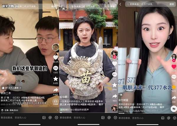 正因如此,「肌肤未来」选择借力#追寻本源之美 IP。一方面,以接地气的定制短剧营销,把握短剧爽感的流量价值;另一方面,配合抖音站内达人多维度的创意解读,从剧情演绎达人@许二木、国风变装达人@小明 再到美妆博主 @方树蓝 等场景种草,两种打法协同配合,肌肤未来既实现了流量和人群触达的广度,项目累计曝光 4.8亿+,互动量 1205万+,多维度的深度种草又为生意转化做好了铺垫,A3种草人群流转率明显优于行业前5%的品牌均值。