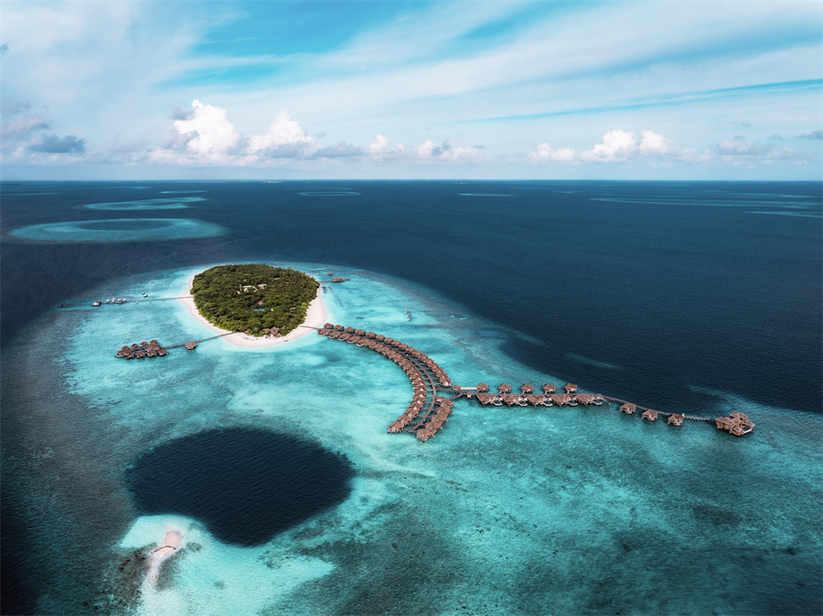 鸟瞰马尔代夫瓦卡鲁度假村迷人的蓝洞