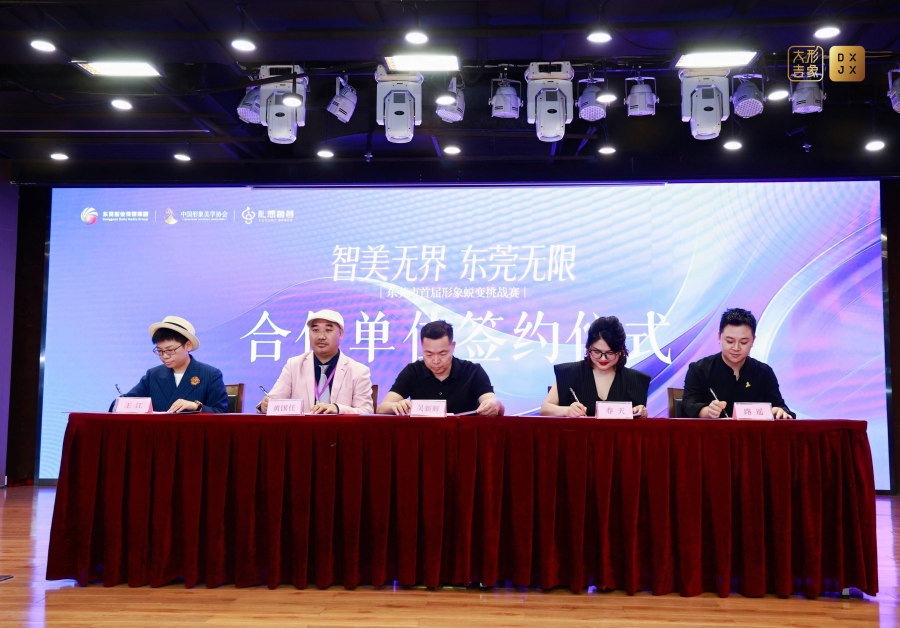仪式最后,主办方与承办方代表共同完成签约启动:东莞报业传媒集团代表、中国形象美学协会春天女士、东莞礼想奢荟董事长黄国任先生、大吉形象CEO王江女士、四季美学主理人路遥共同上台,在现场嘉宾的见证下完成签约,宣告东莞市首届形象蜕变挑战赛正式进入赛事周期。