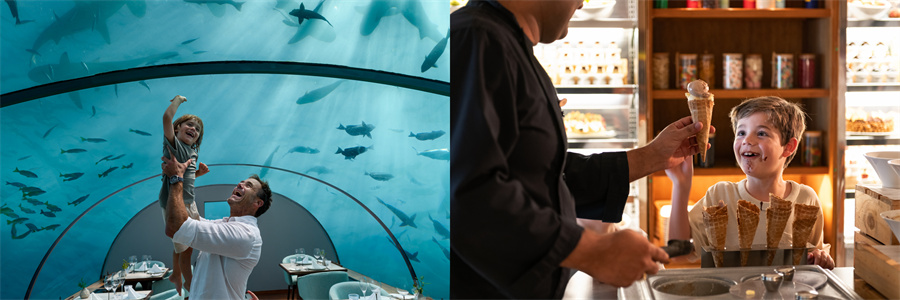 对于偏好中式菜肴的家庭,Ufaa by Jereme Leung餐厅提供正宗中式美食,满足中国家庭的饮食习惯。Ithaa水下餐厅更是全家共享的高光时刻,透明玻璃墙外,热带鱼群和珊瑚礁交织成一幅动态画卷,为用餐体验增添奇妙的海底景观。