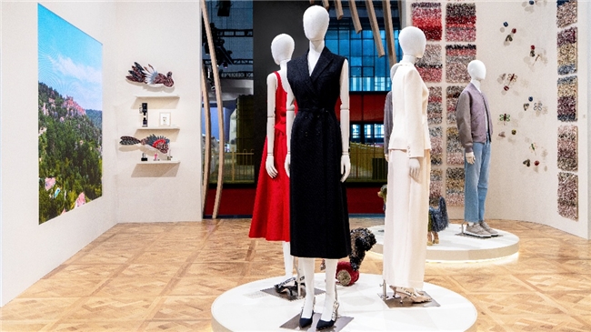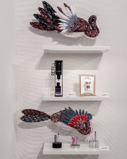 在展区中央,迪奥在本次进博会上带来了多款以可持续理念设计的产品,涵盖男装与女装成衣系列。这些作品选用经认证的可持续面料,遵循严格的环境与社会标准,从原料、工艺到制作流程皆力求降低对生态的影响。与此同时,展区亦呈现一系列迪奥美妆的可持续创新成果,包括迪奥魅惑唇膏系列、迪奥旷野系列、迪奥花秘系列的可替换装设计。通过可重复使用的瓶身与补充装系统,减少一次性包装废弃物,以创新方式延长产品生命周期,诠释迪奥可持续之美的当代愿景。