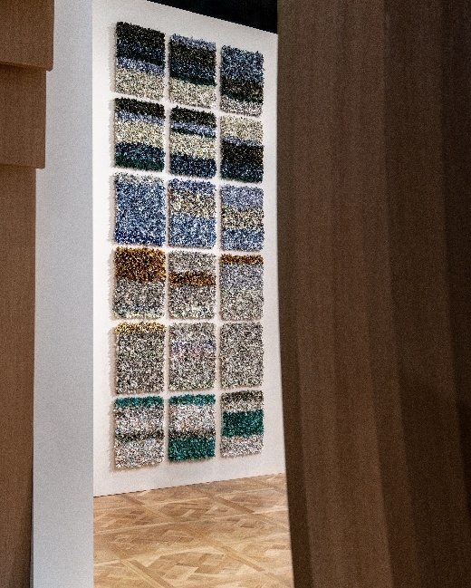在极具现代感的迪奥展区内,四周墙面上展陈着艺术家乔尔•安德里亚诺马里索亚(JOËL ANDRIANOMEARISOA)创作的大型装置艺术品“LES SAISONS IMAGINAIRES”(二零二 一年)。该作品取自品牌往季的真丝丝巾,装裱于多块展板之上,构筑出层叠而富有诗意的视觉景观。作品以细腻的意象礼赞更迭与变迁,赞颂理想的共鸣力量。